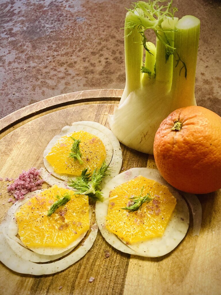 je Person 1 frische Fenchelknolle – waschen und in hauchdünne Scheiben schneiden. Grünzeug vom Fenchel zur Dekoration verwenden.